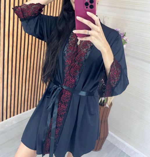 Confeccionado em tule transparente e renda refinada, esse robe feminino oferece leveza e caimento elegante, valorizando a silhueta com charme e feminilidade. A calcinha que acompanha o conjunto harmoniza perfeitamente com o design do robe, criando um visual completo e envolvente.